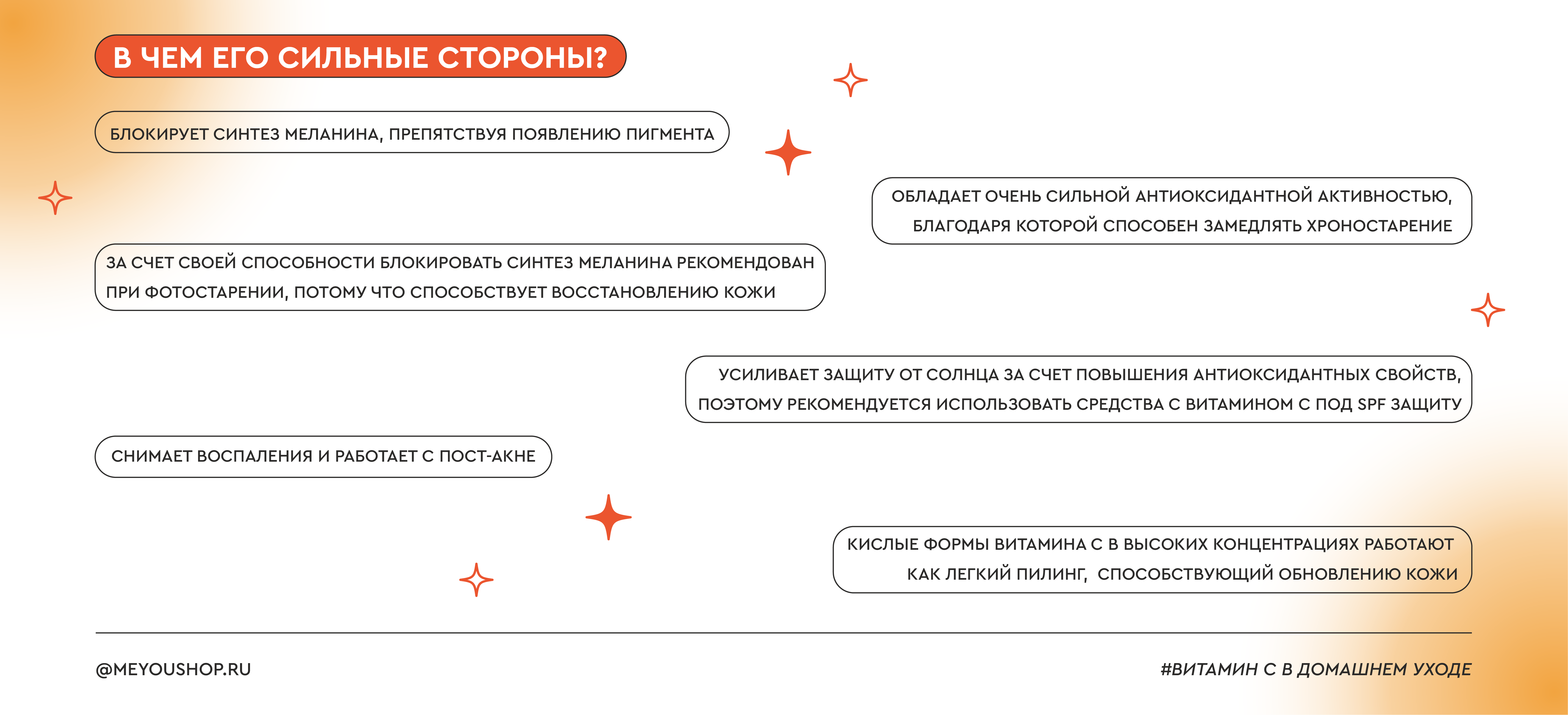 Витамин C не синтезируется и не накапливается в организме человека и поэтому, крайне важно, чтобы он регулярно поступал извне – из продуктов питания, БАДов и, конечно, косметики. Аскорбиновая кислота — это один из самых хорошо изученных косметических ингредиентов, который имеет доказанную эффективность и помогает справиться с самыми разными проблемами кожи.
